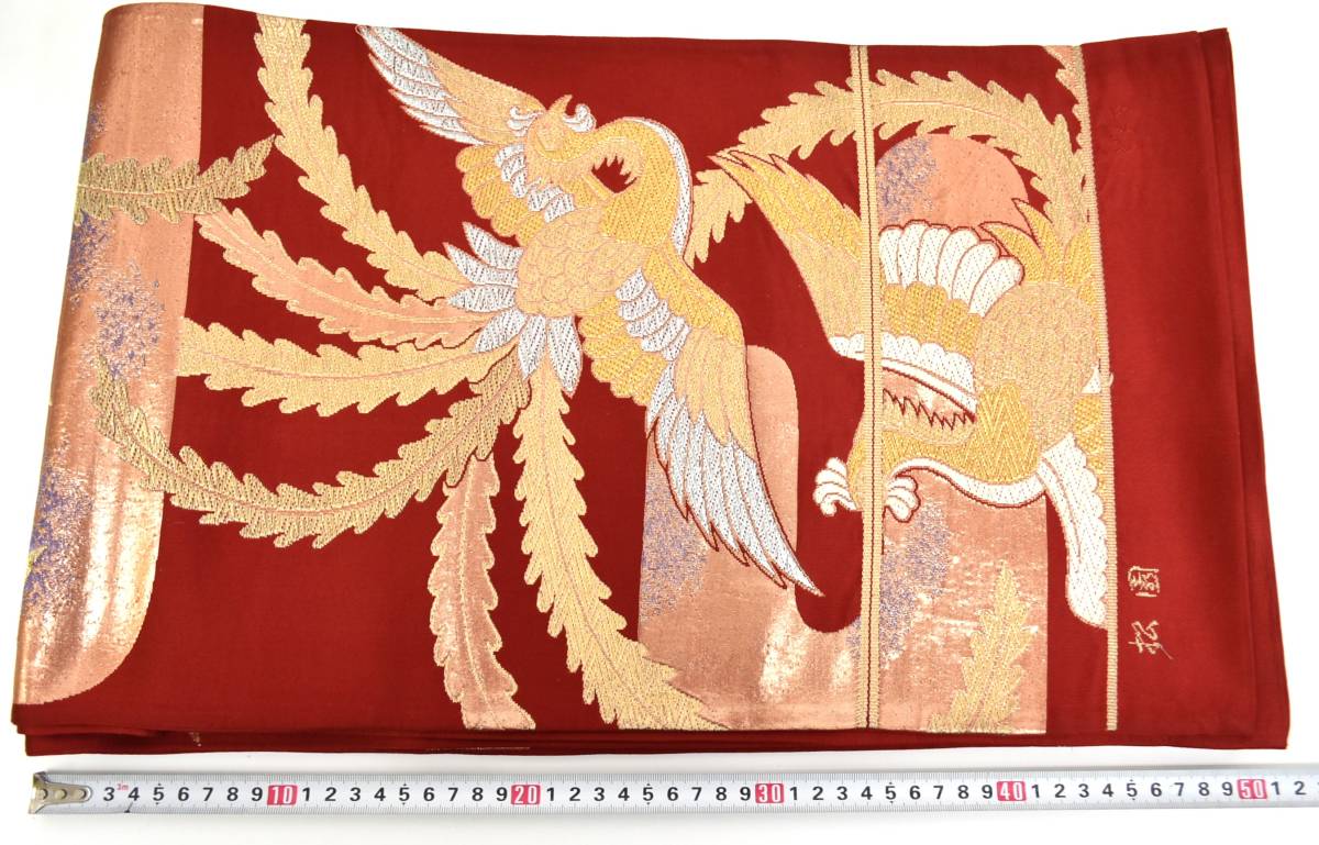 - 帯 着物 和装 和服 鳳凰 松園 どんす 朱色 アンティーク