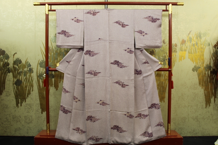 > きもの今昔5864 小紋のきもの 正絹広衿袷手縫い仕立てきもの 濁り藤色霜降り 雲取り合間の小文様柄 身丈158cm