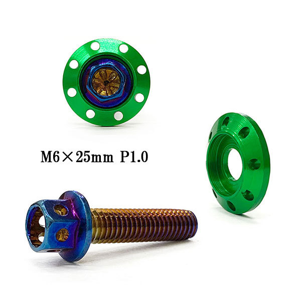 > M6 25mm フランジボルト P1.0 座面枠 20×4mm アルミ カラーワッシャー デザイン フジツボ 車 バイク ドレスアップ 焼きチタン×グリーン