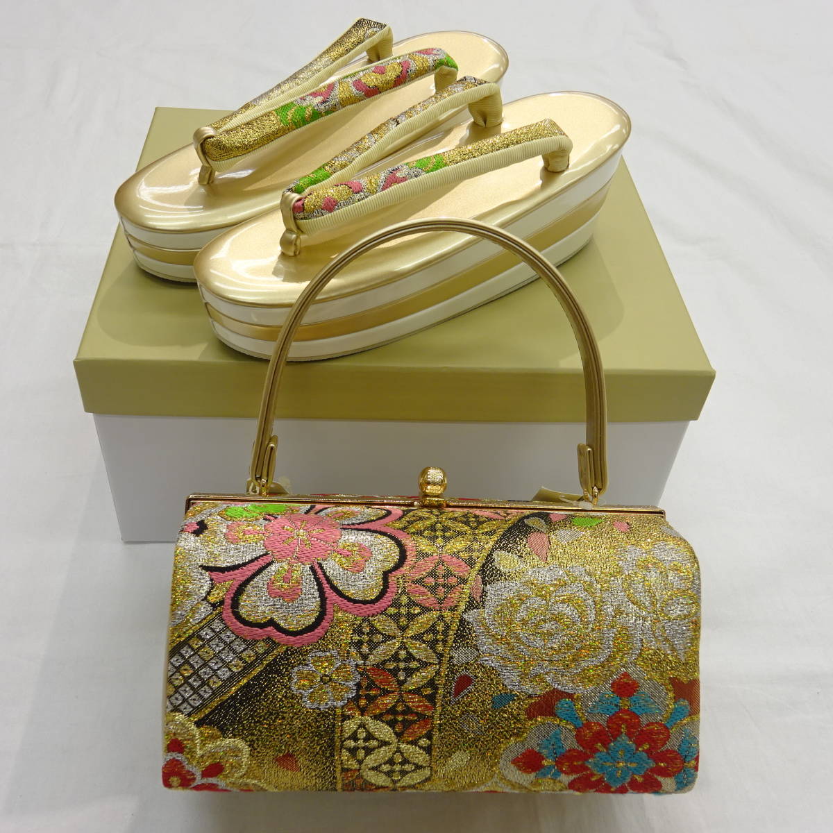 - 新品未使用★★LLサイズ・踵高め★振袖用草履バックセット★金色地です