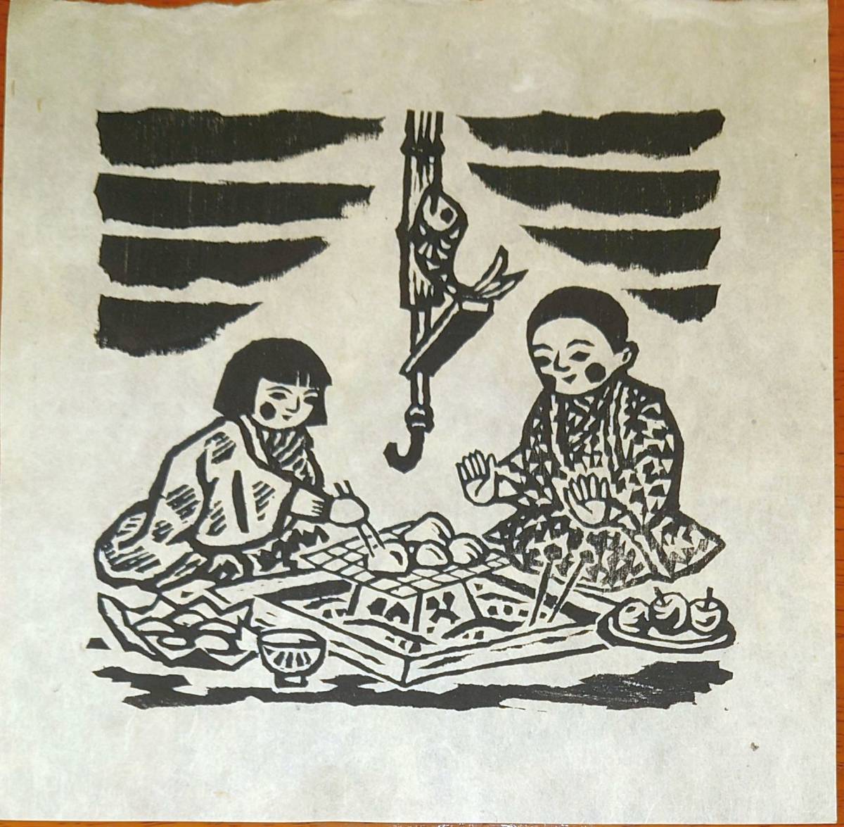 - f23100528〇オリジナル木版画 佐藤米次郎 餅やき みちのく子供の四季 青森県を代表する木版画家 1970年〇和本古書古文書