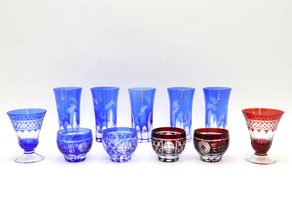 - 【No1321蔵出し】 『 色被硝子 切子 酒器 3種11客セット 懐石杯 骨董品 アンティーク』
