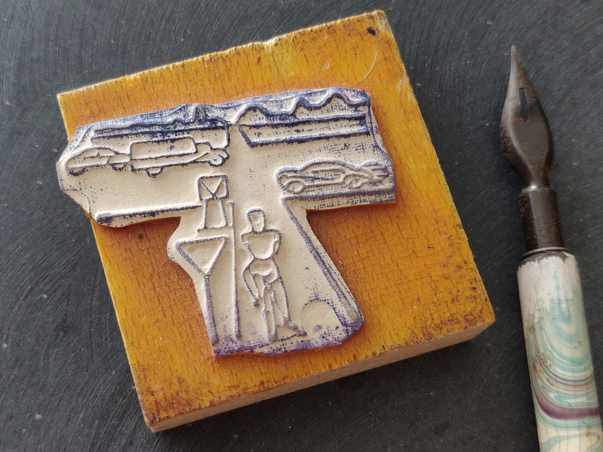 - 自転車 車 トラック 交差点 優先道路 一時停止 交通標識 止まれ 逆三角形 フランス アンティーク スタンプ ヴィンテージ 素材
