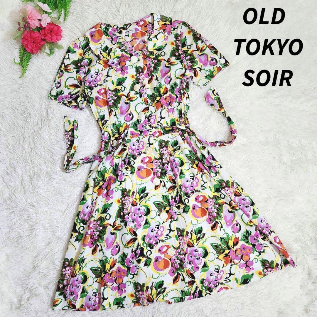 - 東京ソワール PURNE 花柄シャツワンピース・帯リボン付き・半袖 9号 M レトロ古着 68119