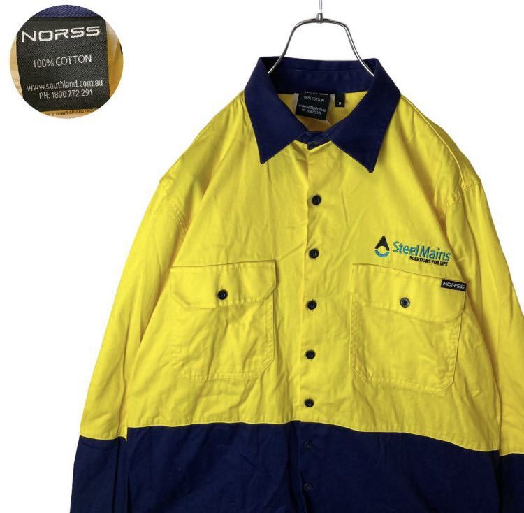 - 希少デザイン古着!2トーンカラーワークシャツ イエロー×ネイビーゆったりサイズ