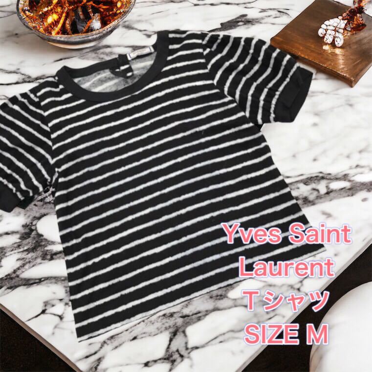 - 【美品】Yves Saint-Laurent 半袖 ボーダー Tシャツ シャツ 白 ブラック イヴ・サンローラン Mサイズ