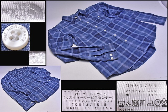 > THE NORTH FACE ★ ノースフェイス ★ 長袖シャツ ★ M ★ ブルー系 チェック柄 ★ NR61704 ★ ポリエステル65% 綿35% ★ 中国製 ★ 中古品