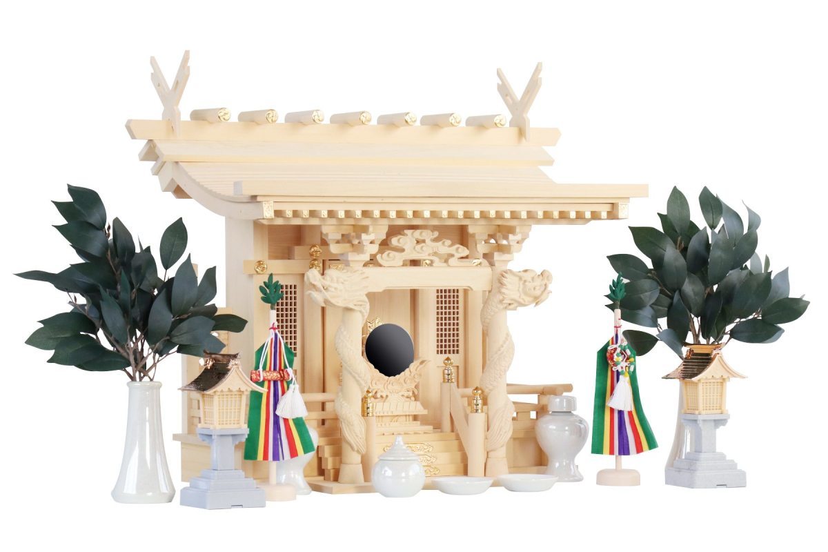 - 神棚セット 風神雷神龍神 宿る神々 真榊 パール神具セット LED灯篭 雄大 一社 檜葉製