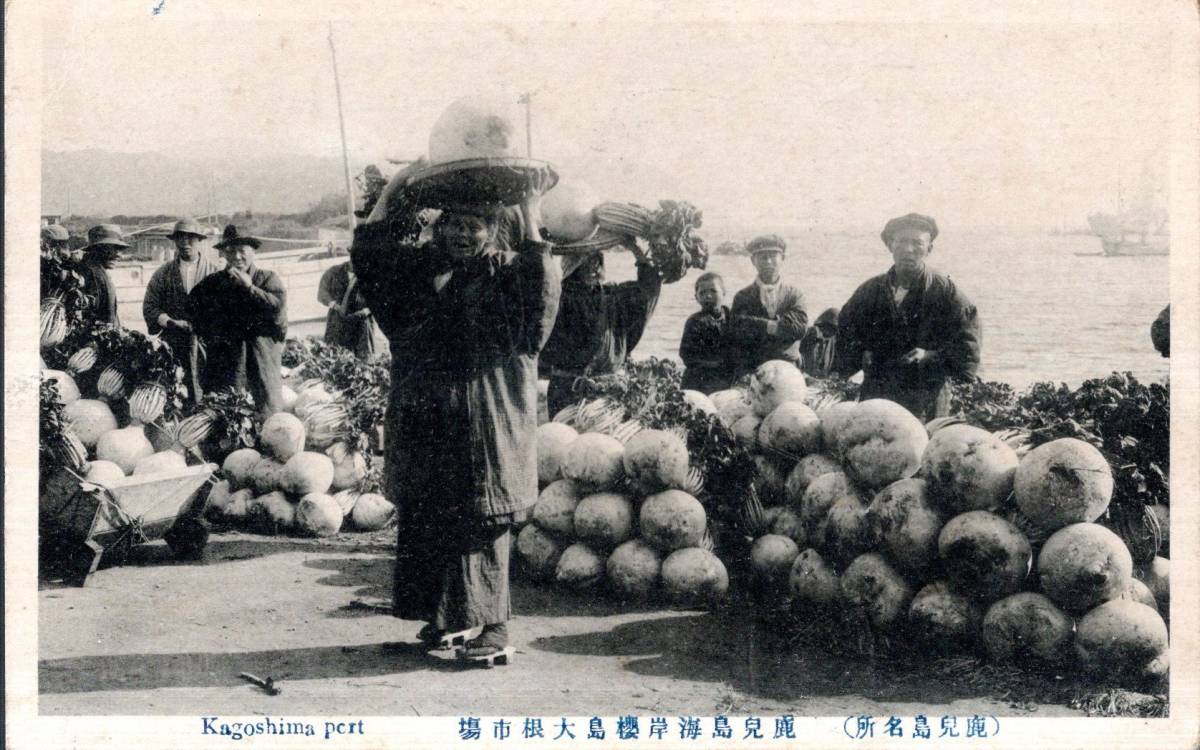 - 絵葉書 鹿児島名所 鹿児島海岸桜島大根市場 愛知県知多郡内海町某氏宛 壹銭五厘切手貼付実逓便エンタイア絵はがき
