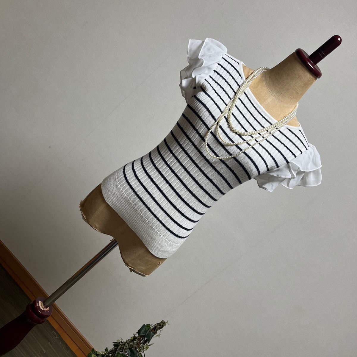 > 8-7新品 ラッフルフリルスリーブニット半袖オフホワイトボーダーティアードレースプルオーバー tocco closet(トッコクローゼット) 9号M