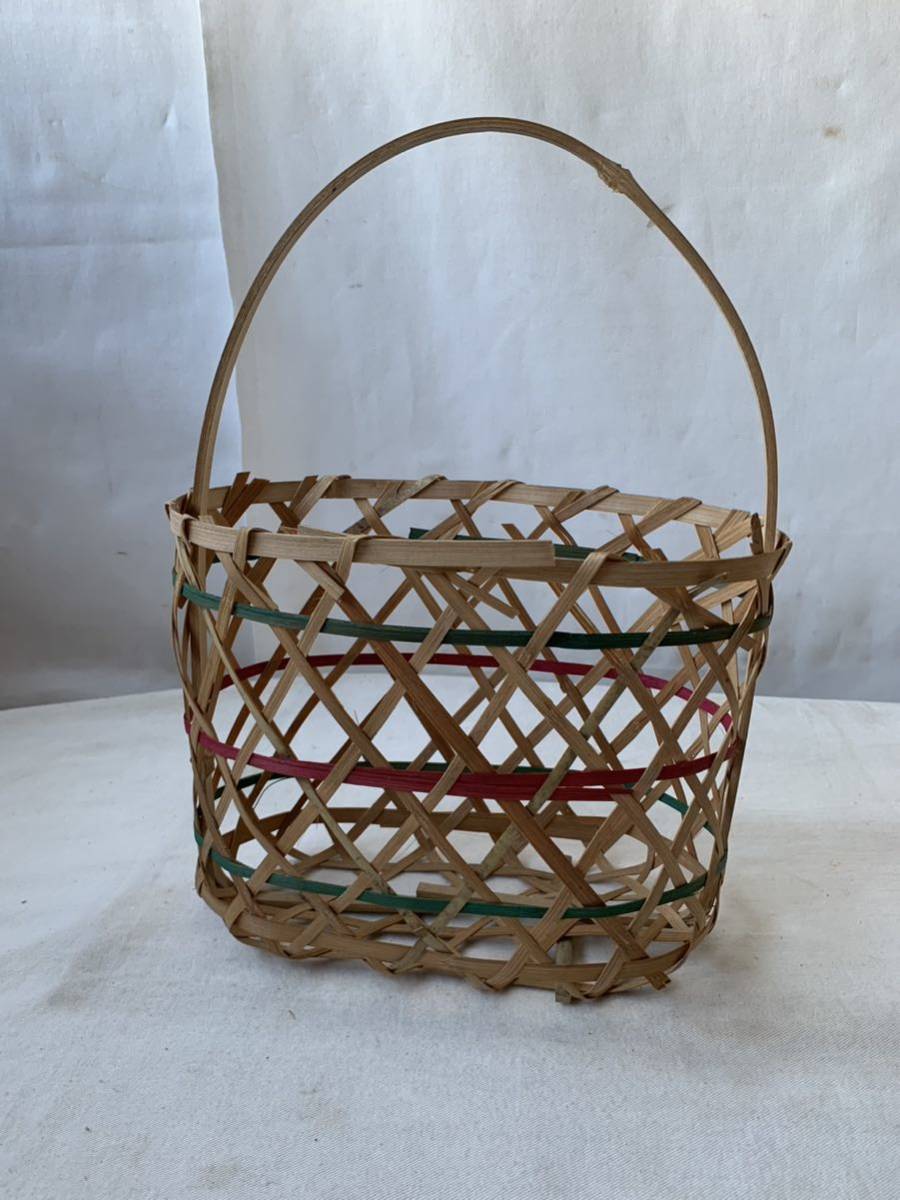 - 配色が素敵な持ち手付竹カゴ籠かご 小物入バッグバスケット竹工芸レトロ古道具アンティークビンテージ什器インテリアディスプレイ収納雑貨