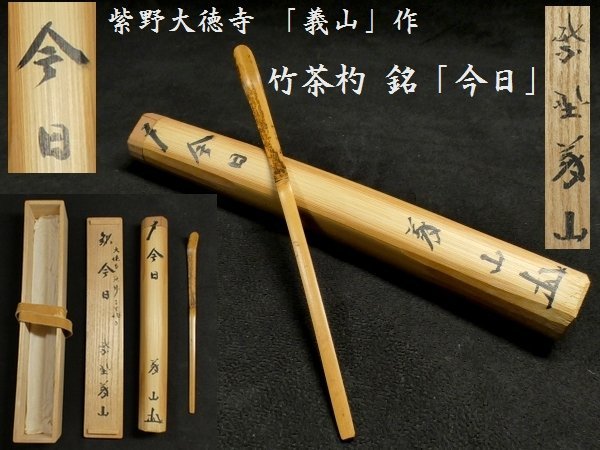 【 恵 #0928 】 竹茶杓 銘 「今日」 紫野大徳寺 「上田義山 花押」 茶杓 共箱 茶道具 竹筒
