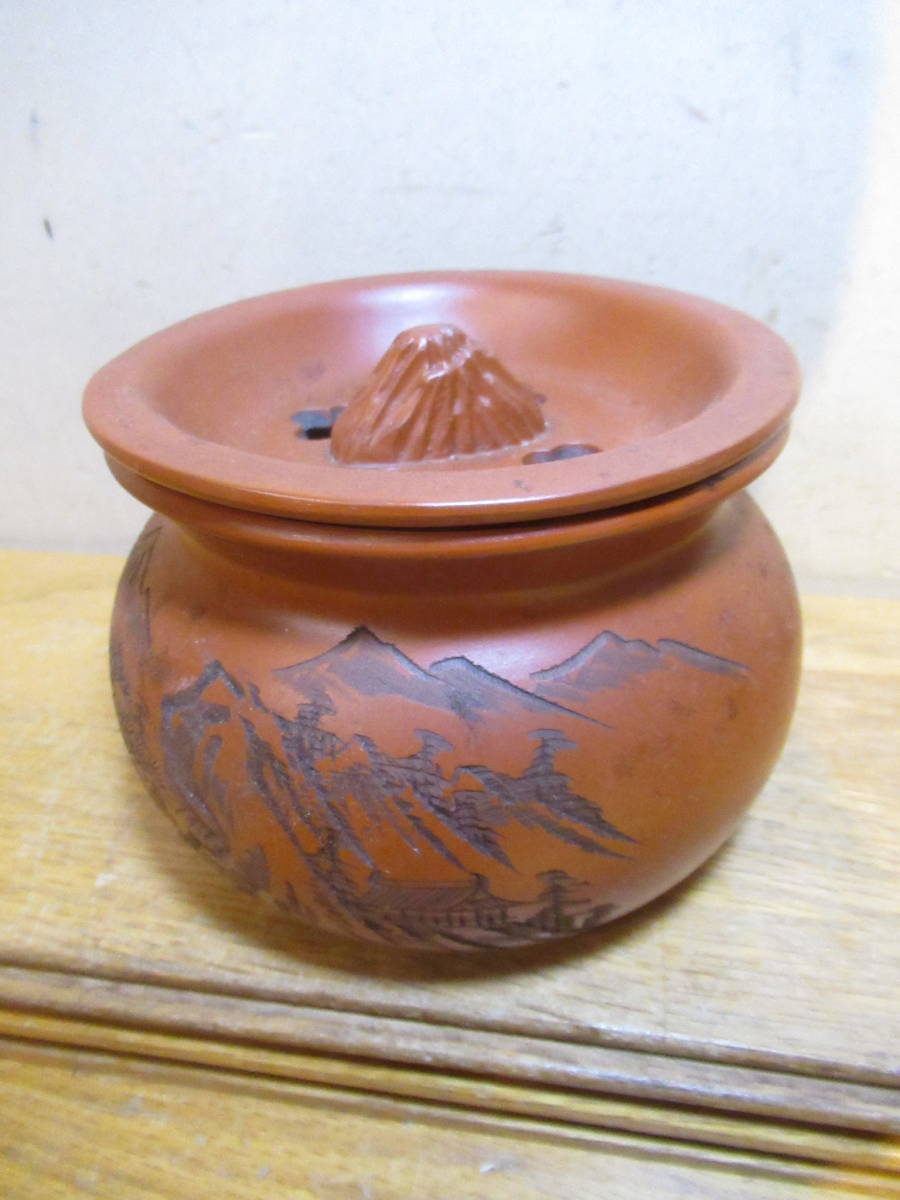 - 朱泥 煎茶湯こぼし 常滑焼 山水図彫 箱無し 中古茶道具 煎茶道具