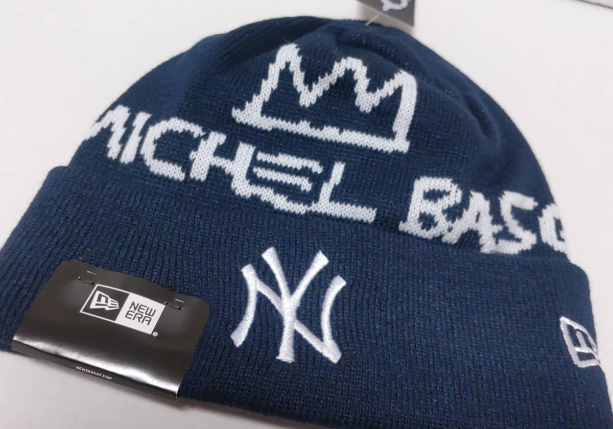 > 2023 NEW ERA ニューエラxヤンキース×バスキア コラボ ニットキャップ 折り返し 紺 編み込み 刺繍 フリーサイズ※未使用品/商品タグ付き