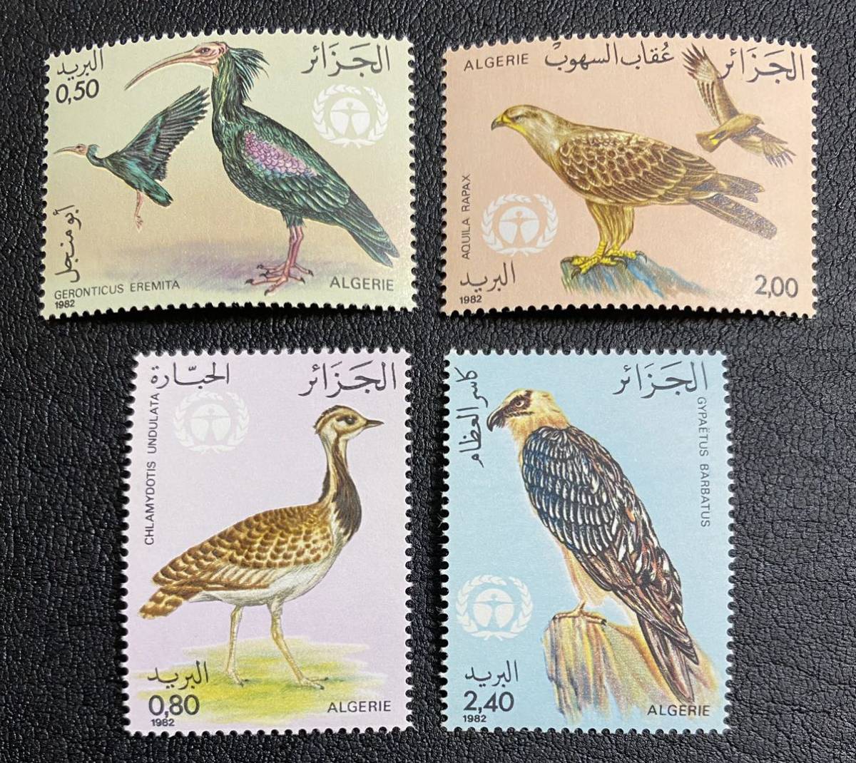 - アルジェリア 鳥 フサエリショウノガン ヒゲワシ ホオアカトキ サメイロイヌワシ 4種完 未使用 NH