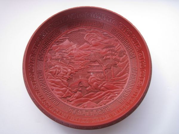 - 朱色 樹脂製 盛鉢 菓子鉢 山水 漆塗 飾り 彫り 外黒:内朱 外径27×H7㎝ /21N12.21-29