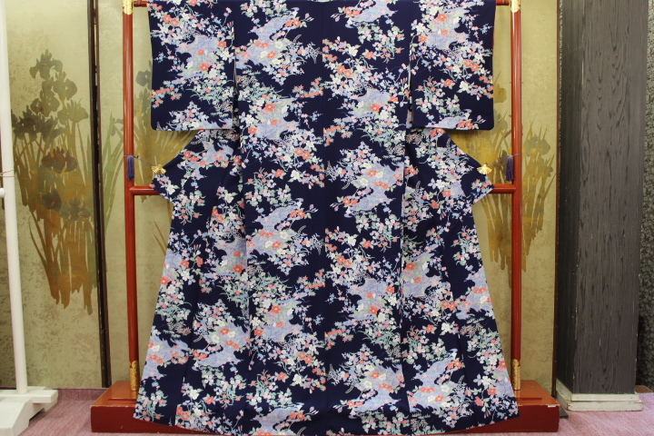> きもの今昔6334 合繊のきもの 広衿袷仕立て 一越地濃紺色地 渓流に野の花柄 汚れ問題なし 身丈166cm