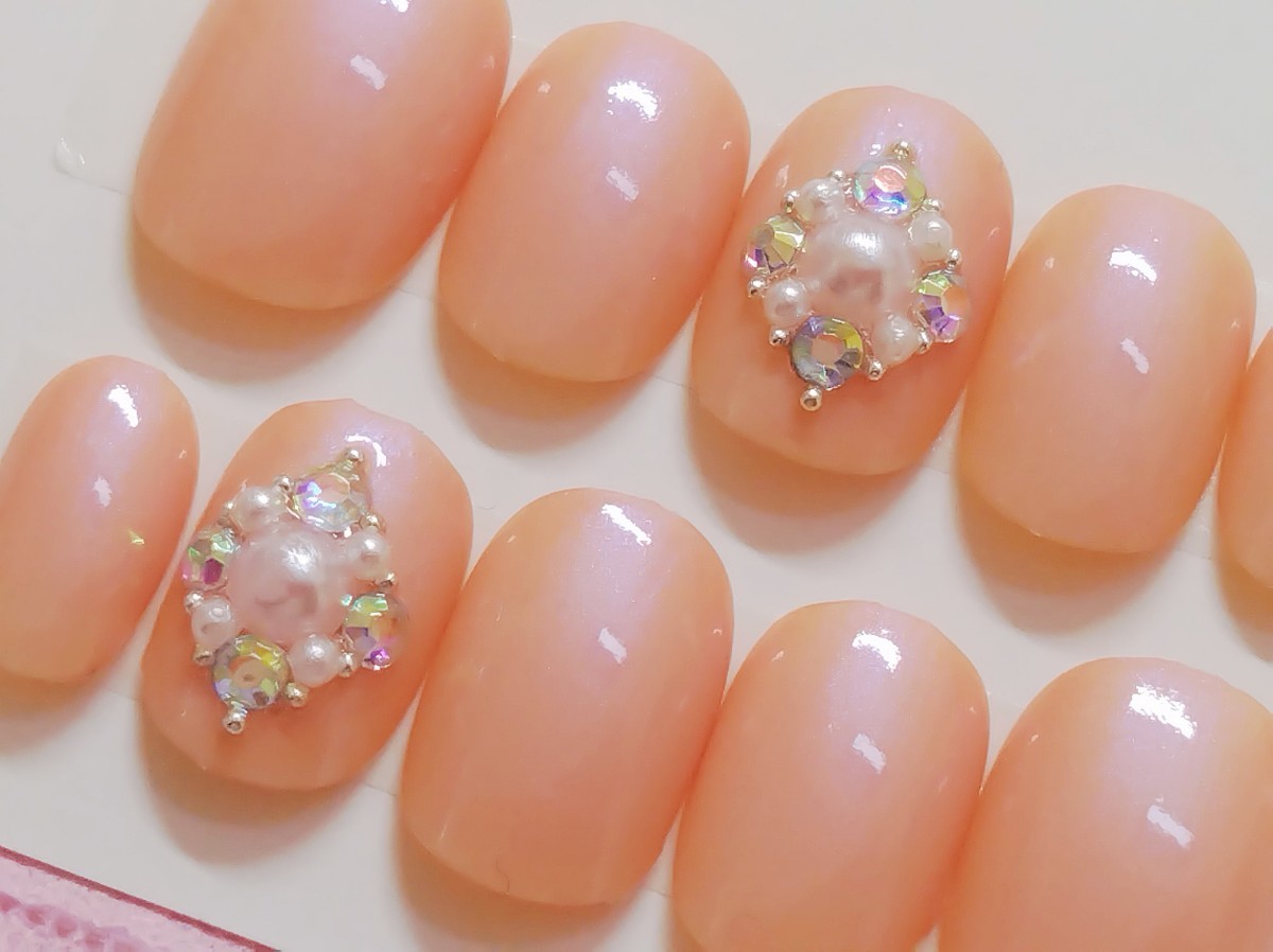 - Sサイズベリーショート・ベージュベースパールビジューワンポイントエレガントネイルチップシンプルパーティウエディング付け爪