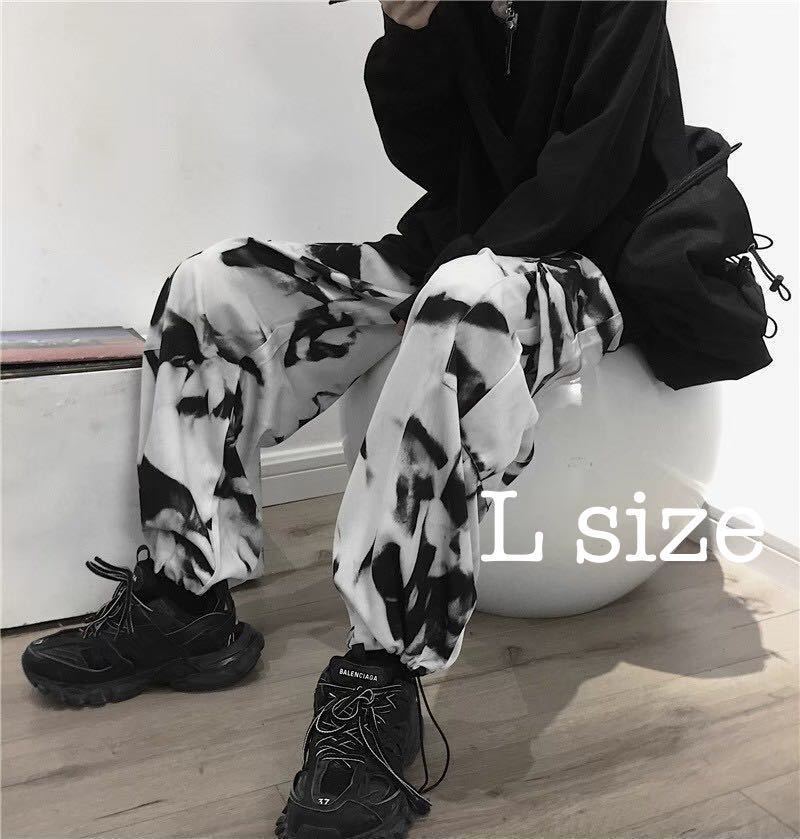 - カーゴパンツ ワイドパンツ タイダイ柄 ワークパンツ ユニセックス 男女兼用 白黒 L