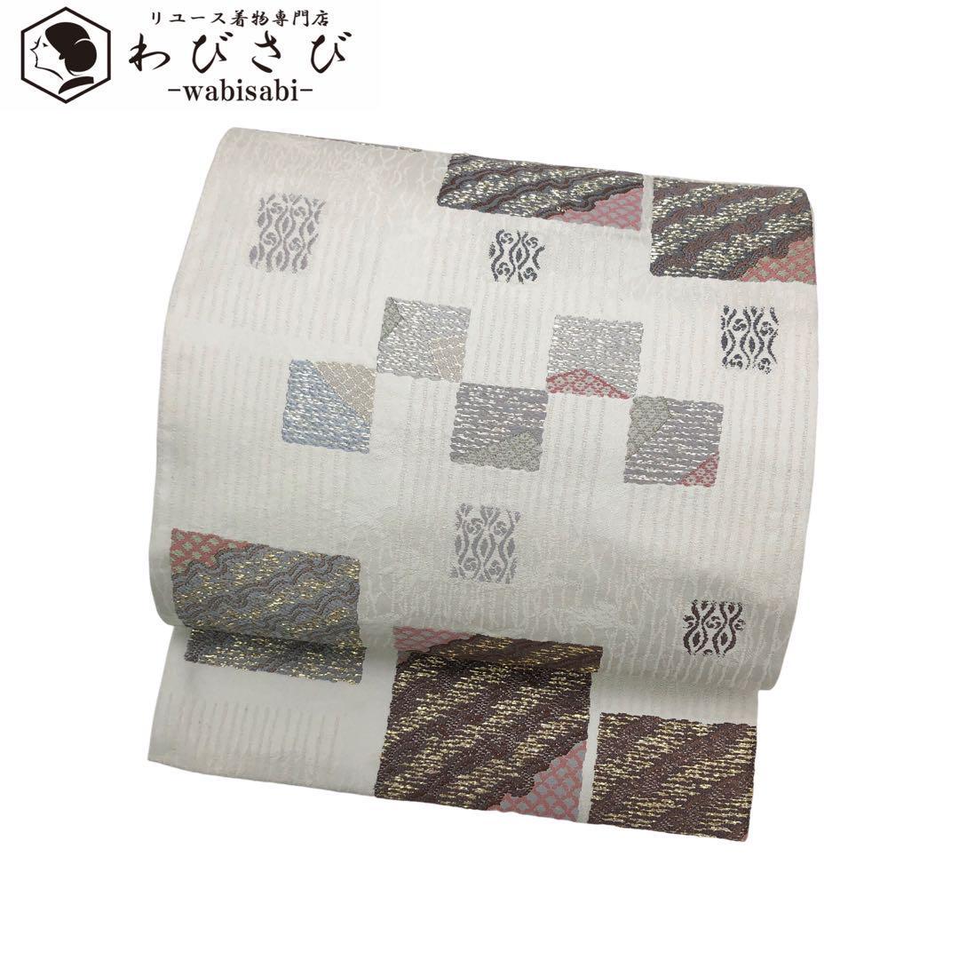 - 袋帯 西陣 藤沢機業店 市松斜目取 金銀糸 証紙付 卯の花色 O-3246