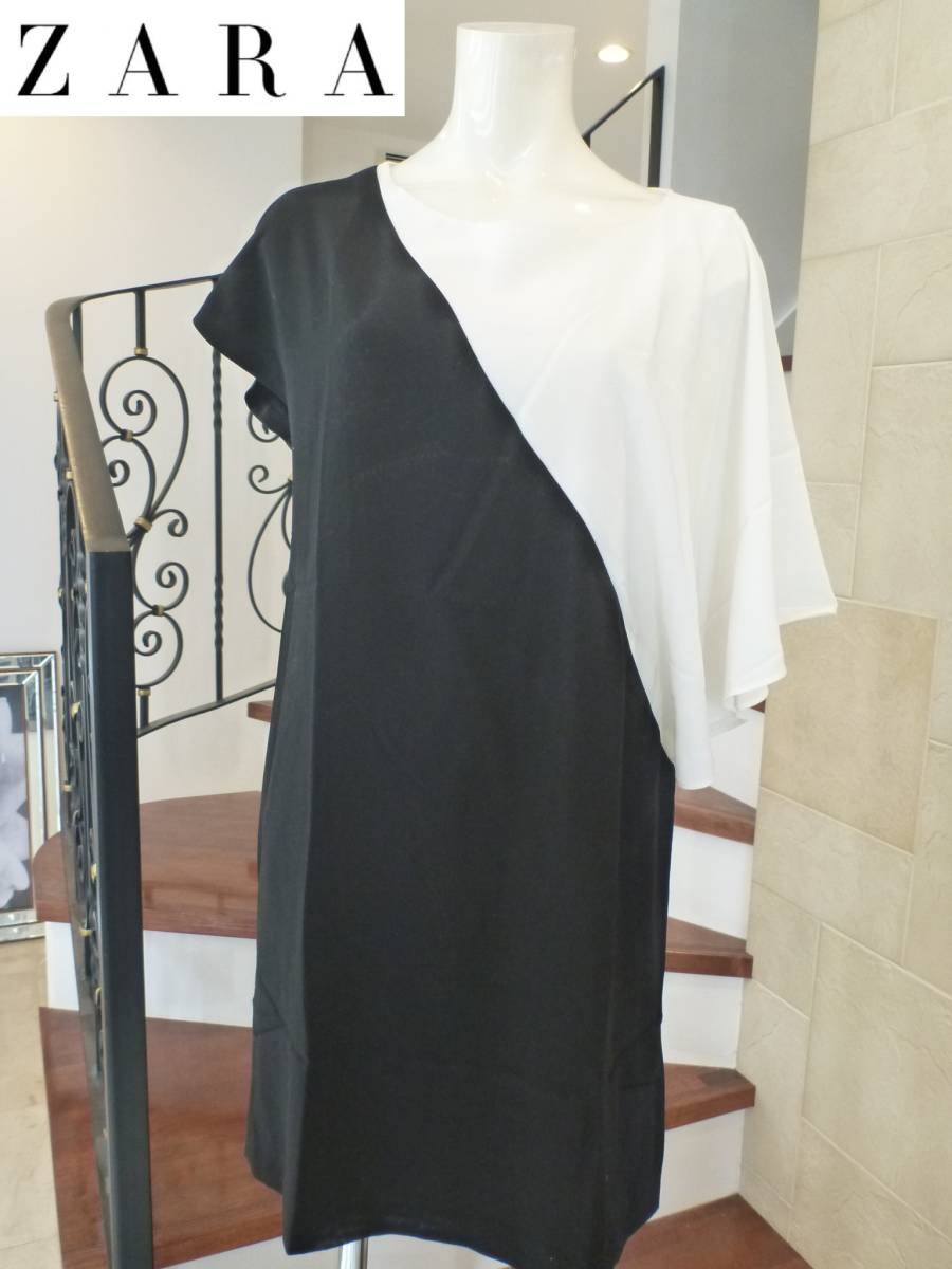 - 美品 ZARA ザラベイシック★白×黒 バイカラー 左右非対称袖ワンピース M相当