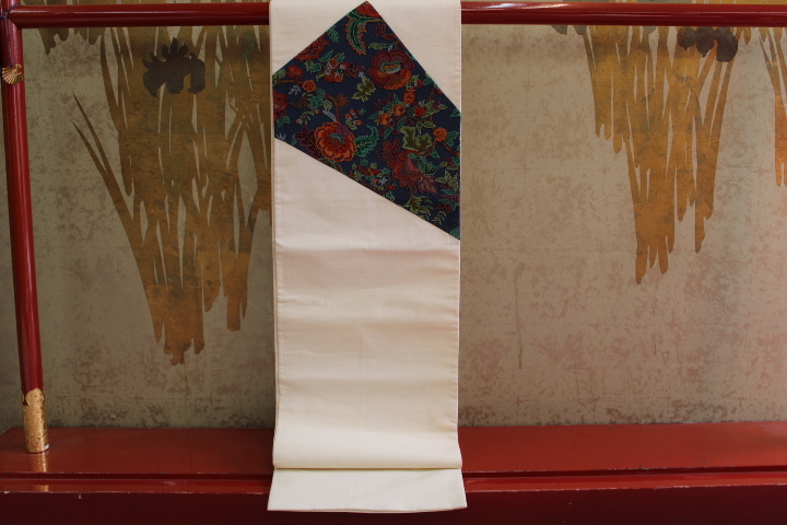 > きもの今昔6484 名古屋帯 正絹紬地パッチワーク九寸名古屋帯 太鼓と前腹に相良刺繍手描き色差し 帯の長さ450cm