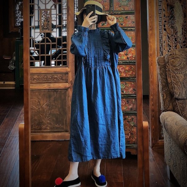 - lgn 1646 ロングワンピース チュニック 襤褸 アンティーク風 洋服ミックス ロマンファッション 楽ちん ギザ襟 ネイビー 麻100% リネン
