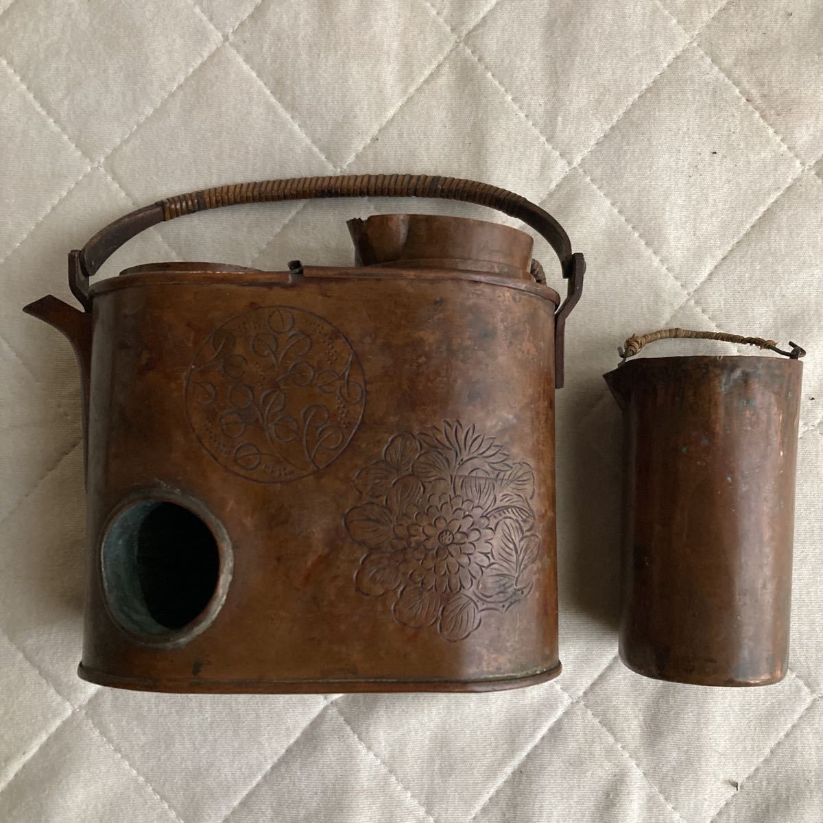 - 明治時代.大正時代.銅製.花唐草象嵌.入りチロリ.酒沸かし器.持ち手は全て古い竹で巻いて居ます.漏れ無し.完品.全ての重さ.約 325gです.