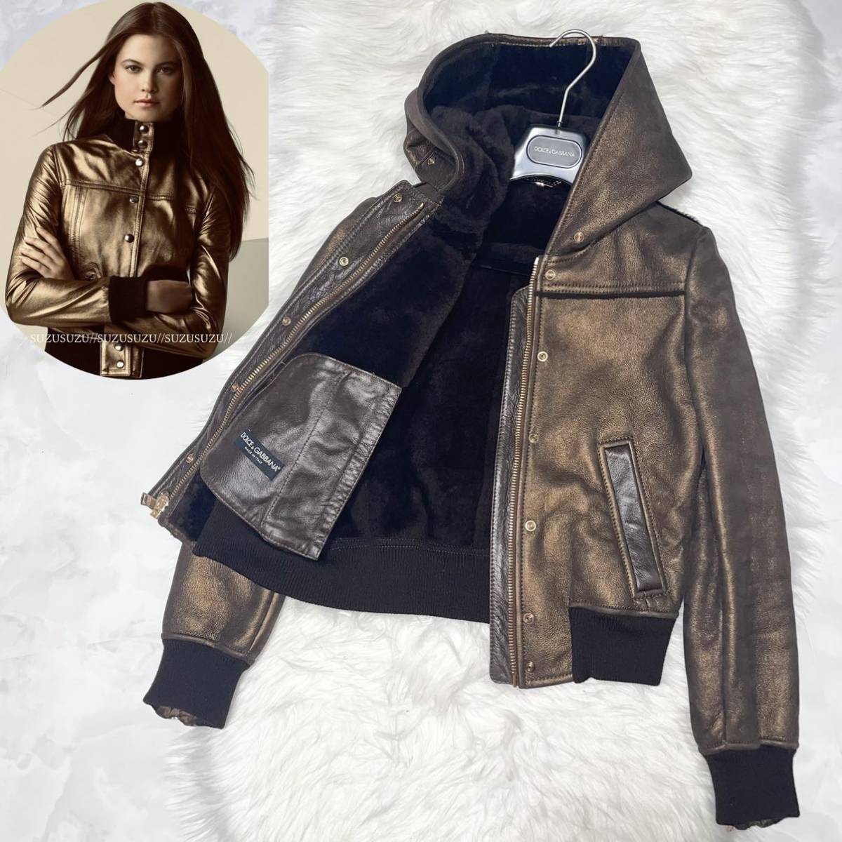 > 本物 ドルチェ&ガッバーナ フード付 裏地フルファー レザー ブルゾン ジャケット 38 ゴールドブラウン ドルガバ DOLCE&GABBANA