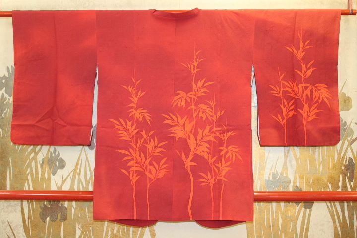 - きもの今昔6516 道行きコートコレクション 正絹全体ぷつぷつネップ入り生地 手描き蝋彩染め 80cmコート丈