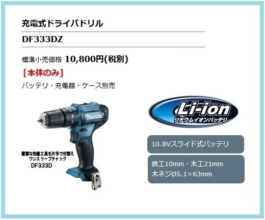 - マキタ 10.8V 充電式ドライバドリル DF333DZ (本体のみ) 【豊富な先端工具を片手で付替えワンスリーブチャック】 ■マキタ純正/新品■