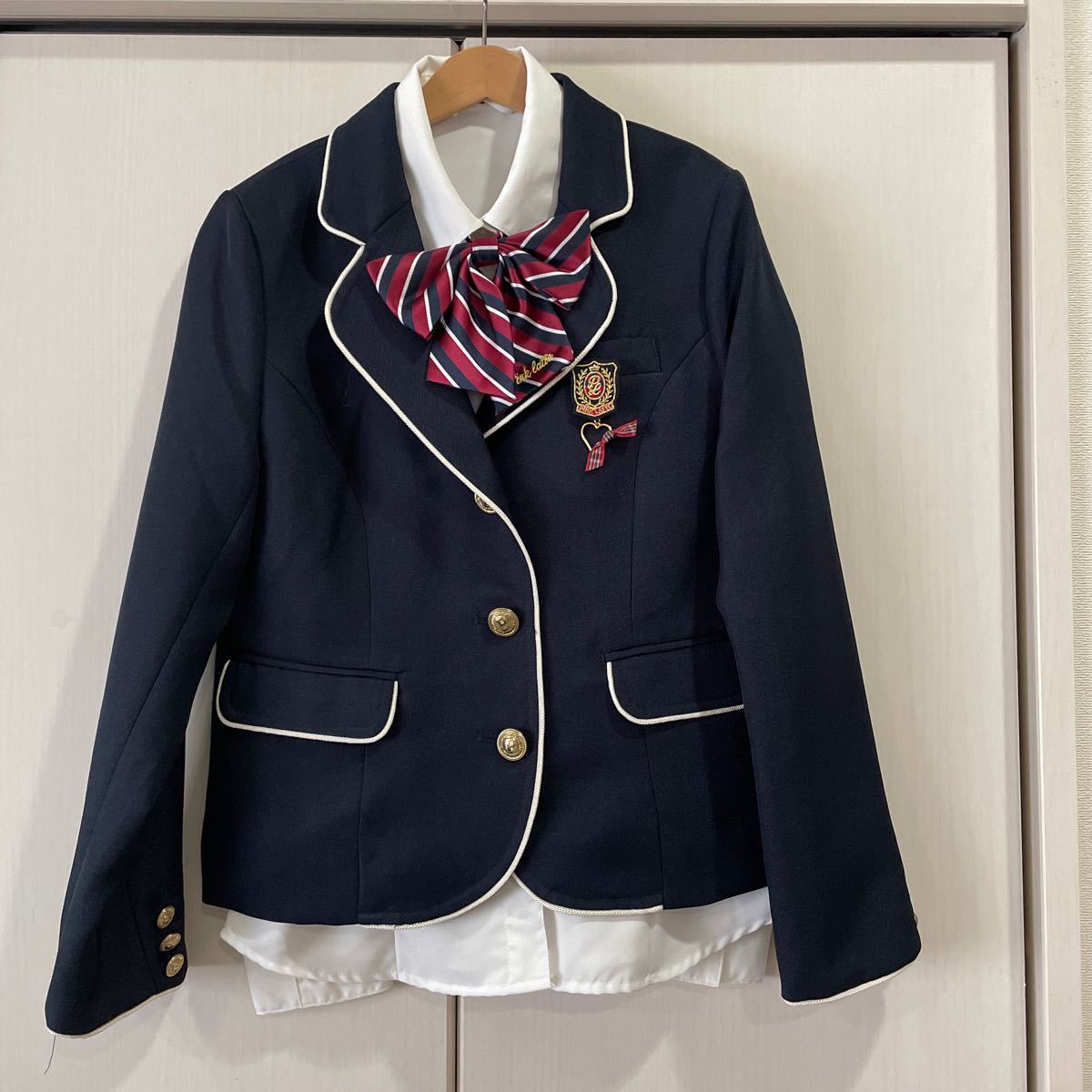 - 送料無料 PINK-latte ピンクラテ 紺色ブレザーとリボンブローチ3点セット ネイビージャケット XS/150cm 卒業式卒服 シャツ別売り 送料込み