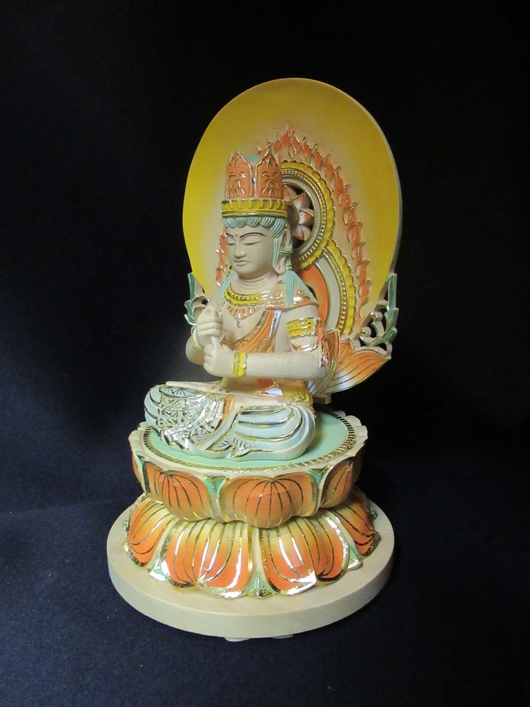 - 「大日如来/本柘植/切金淡彩(濃い)/円光背/2.0寸/低丸台」総高15.5cm/木製/「20019」川本仏壇店/川本仏