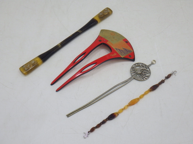 - h5B064Z- 和装小物 髪飾り べっ甲 笄(こうがい)/簪(かんざし) 漆/彫金 透かし 平打ち/べっ甲 羽織紐 計4点
