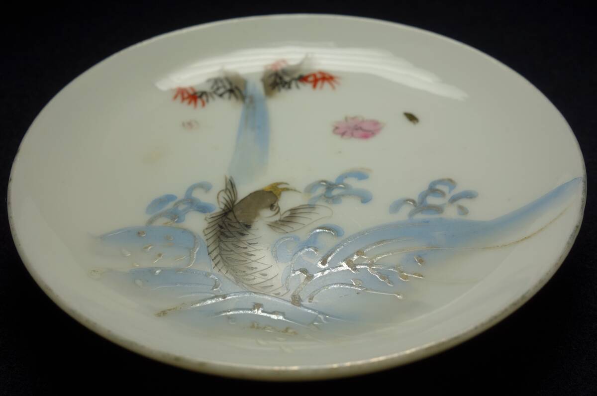 - 清朝末期(孫文時代) 白磁 鯉魚瀧昇り図 茶豆皿 古茶器 陶磁器研究