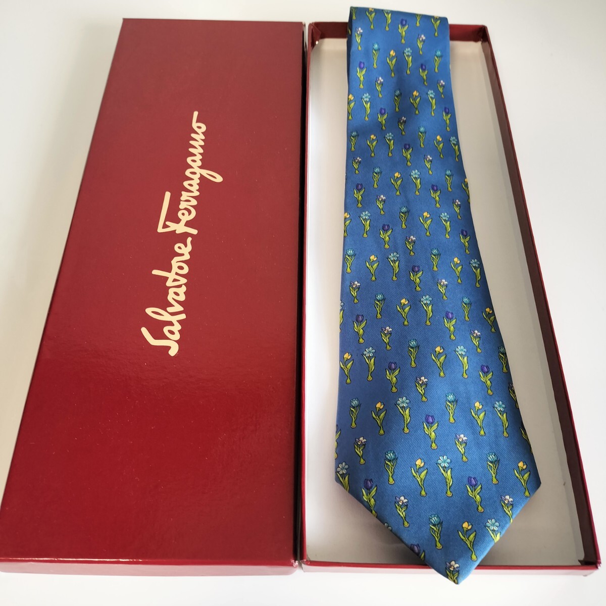 - Salvatore Ferragamo(サルヴァトーレフェラガモ)青マルチカラー花咲くネクタイ