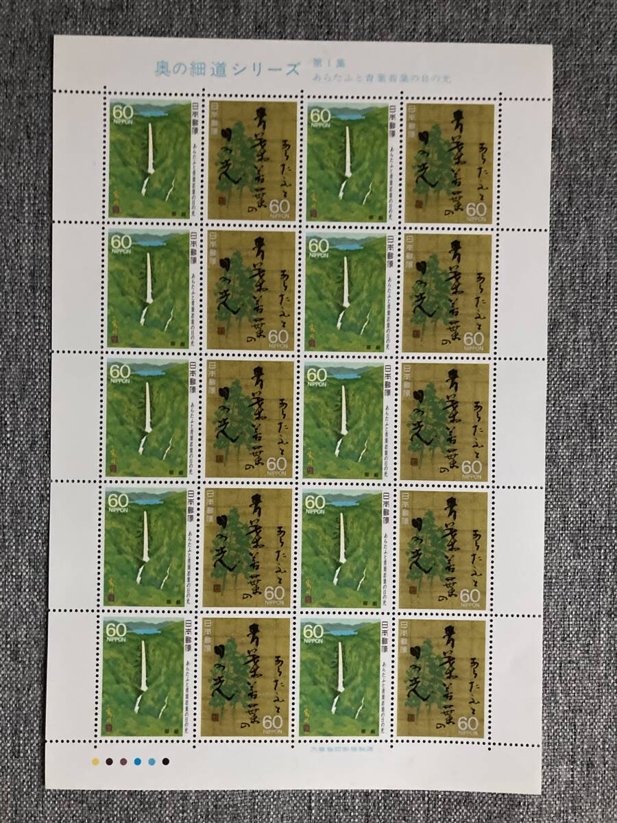 - ★未使用 奥の細道シリーズ 第1集 華厳 句の書 あらたふと 青葉若葉の 日の光 松尾芭蕉 昭和62年 1987年 2種連刷 切手シート 60円20枚