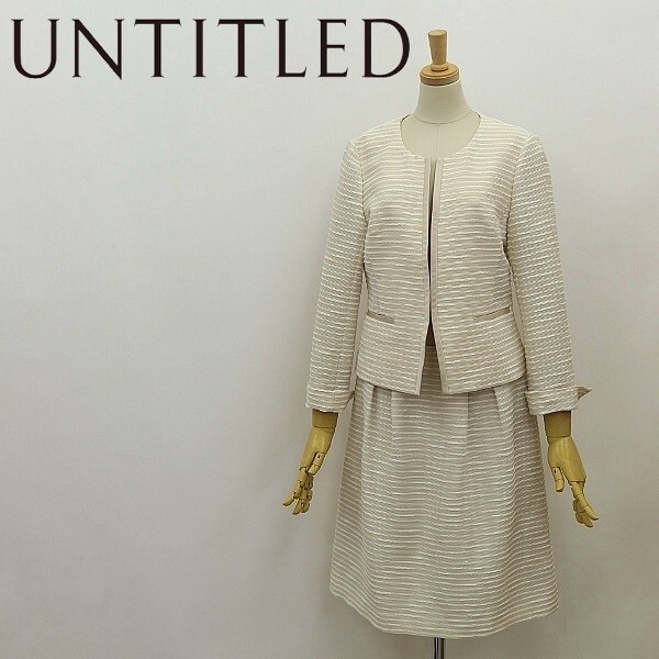 - ◆UNTITLED アンタイトル ボーダー柄 ノーカラー ジャケット&タック スカート スーツ セットアップ ベージュ×ホワイト 3