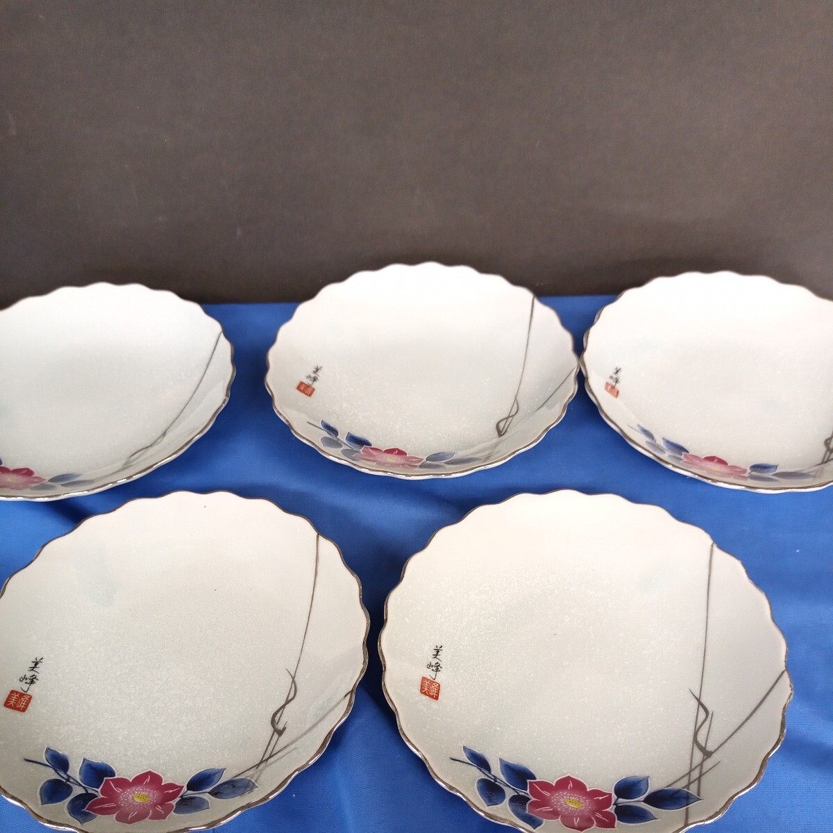 - 昭和レトロ■美峰 椿柄 中皿(取り皿) 五枚セット 銀縁