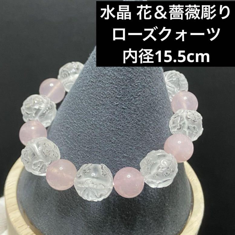 - B836 水晶 花&薔薇彫り ローズクォーツ 内径15.5cm