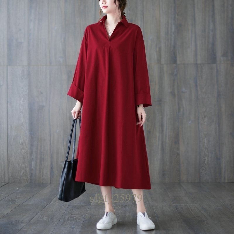 - A5605☆新品秋カジュアル 綿麻 無地 ゆったり大きいサイズ 体型カバー 長袖 シャツロングワンピース ワイン