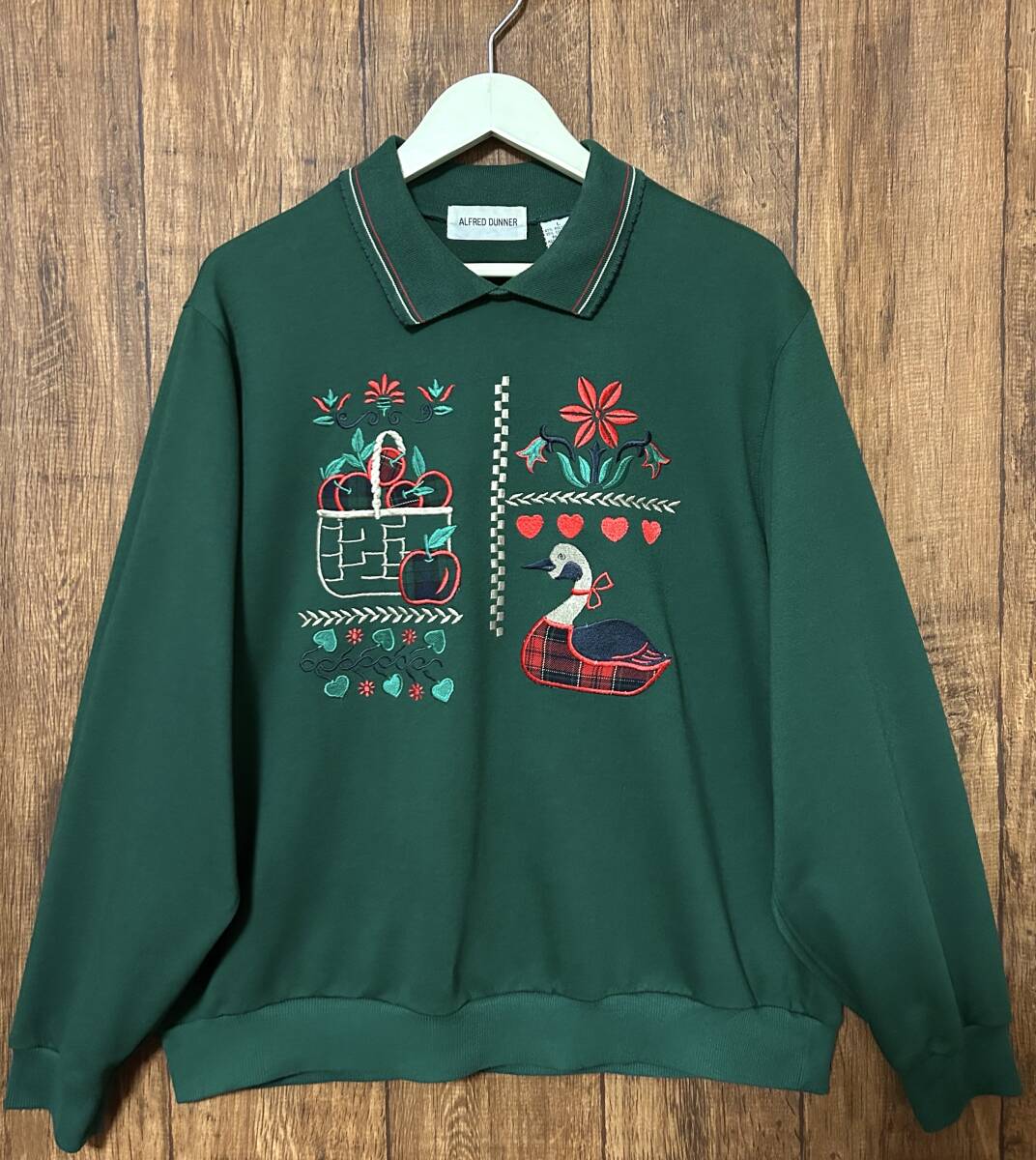 > 刺繍 スウェット トレーナー 襟付き グリーン 深緑 鳥 リンゴ 花 ハート レトロ カントリー ヴィンテージ vintage used 古着/club723(N471