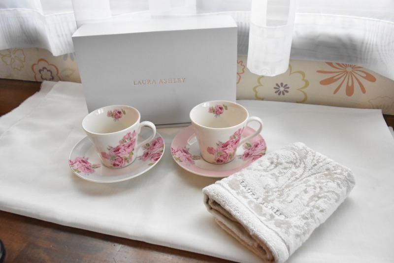 - PAY1・YA2*ローラアシュレイ*ペア コーヒーカップ&ソーサー2客 タオルセット*LAURA ASHLEY*C&S*薔薇バラ*ローズ*おしゃれ