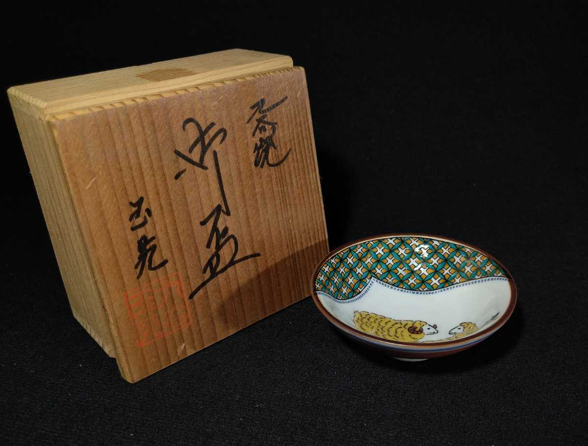 - 九谷焼 玉苑 「御盃」 金彩 色絵 双羊文 酒盃 共箱 ぐい呑 酒器 bm-03i2007a