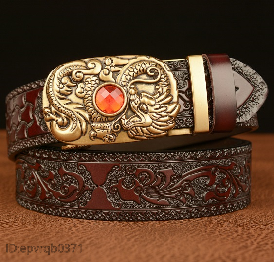 > レザーベルト※新品 オートロック式 バックル ドラゴン龍 本革 宝石飾り メンズベルト 幅3.5センチ 紳士 長さ調整可能 /茶色
