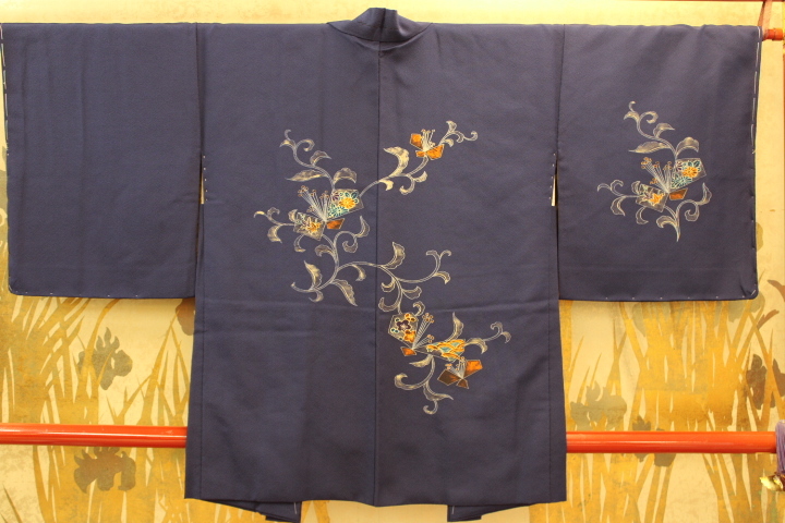 - きもの今昔6796 お羽織コレクション 正絹一越地に手描き 紺色地に唐花の絵羽織 シツケ付き未使用品 羽織丈82cm