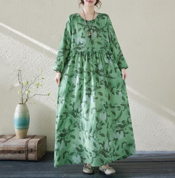 - LB516 ナチュラル ゆったり 綿麻ワンピース きれいめ 小花柄 長袖 着痩せ 大きいサイズ ミモレ丈 ロングワンピース カーキ