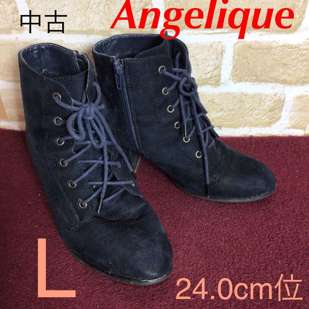 > 【売り切り!送料無料!】A-358 Angelique!ショートブーツ!ネイビー!L 24.0cm位!レースアップブーツ!おしゃれ!太めのヒール!中古!