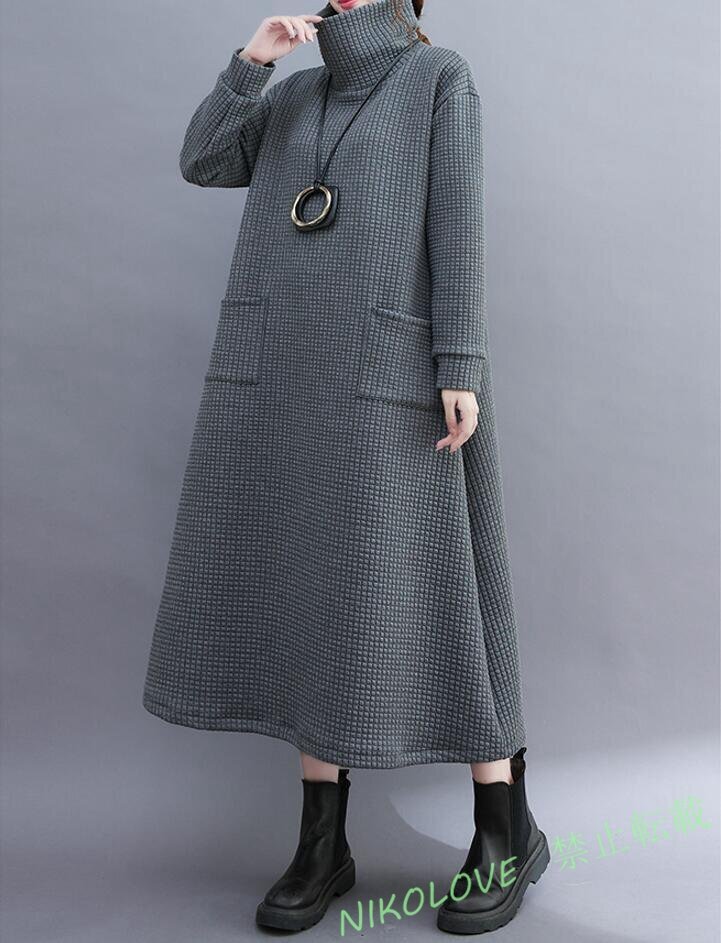 - LC168 大きいサイズ 無地 ロングワンピース ハイネック 暖かいカジュアルワンピース 大きいサイズ 灰/ XLサイズ