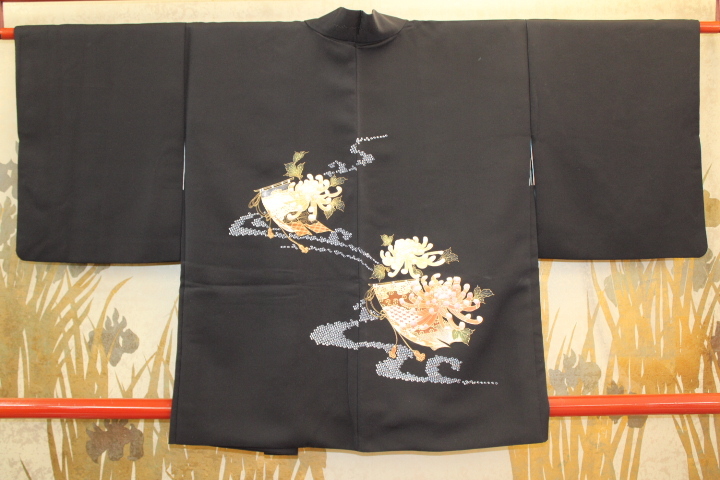 - きもの今昔6896 黒羽織コレクション 正絹十日町製高級黒絵羽織 鹿の子流水に几帳と乱菊の絵羽柄 身丈78cm